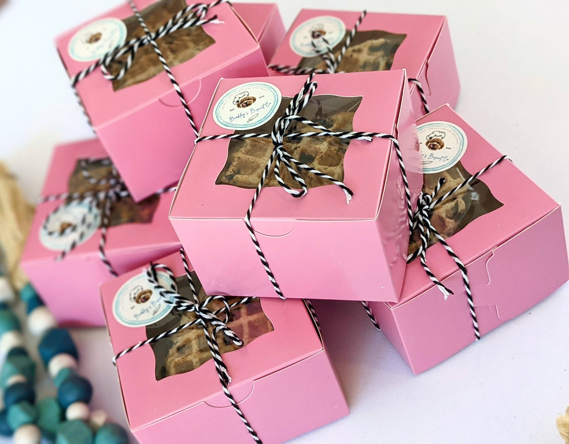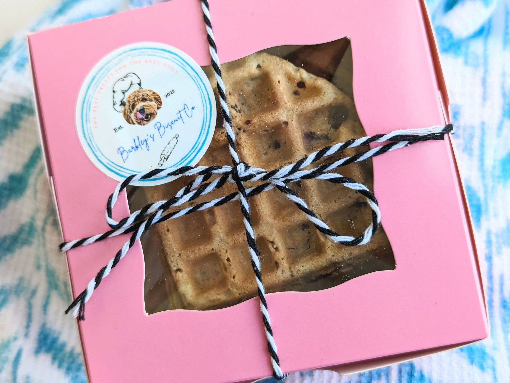 The Woofle! Spoil your pooch with their own "waffle" for breakfast! Made on waffle iron by hand, these treats are crispy crunchy and made with just a few simple ingredients including blueberries (full of antioxidants & fiber) and dash of coconut oil (for healthy coat & skin)! Packaged in a pink pastry box with baker's twine. Wheat free. Ingredients: Oat flour, unsweetened applesauce, blueberries, egg, organic coconut oil. Lab certified dietary analysis included on packaging.